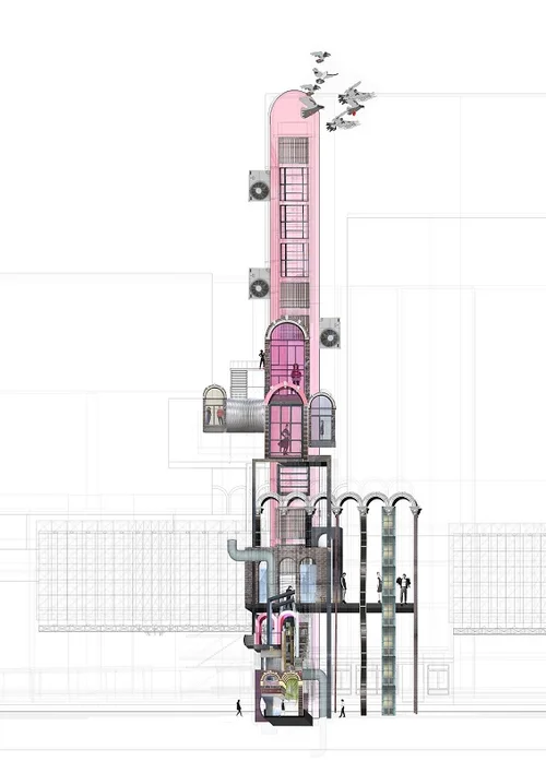The final series of drawings is a new set of proposed interventions that unsettle and disrupt the day-to-day functioning of the building in its current form, by inserting key moments of pause, reflection and recollection. Beyond this, the project is a brave attempt at spatialising a murky and often undealt-with moment in our national conscious.