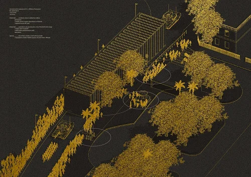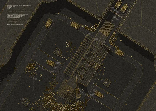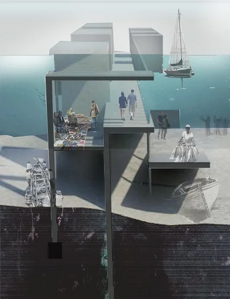 The project is located along a 3.2km stretch of the island’s outermost edge, beginning with the existing Port Authority and ‘spilling out’ into both the sea and the public land surrounding it. It will take the form of both a landscape and a formal building, although split into several discrete elements or interventions. Following Woods, the Free Trade Zone is intentionally uncomfortable, aimed at disrupting our comfortable, bourgeois and essentially Western ideas of space, form, and programme. ‘You can’t bring your old habits here. If you want to participate, you will have to reinvent yourself.’ (qtd in Ouroussoff, Nicolai. New York Times, August 2th, 2008). Using terms such as ‘guise’, ‘cognitive dissonance’, ‘subversion’ and ‘terra nullius’, the project aims to design the impossible, a place in crisis, a ‘smooth space’ in which all are equal, neutral before the law.