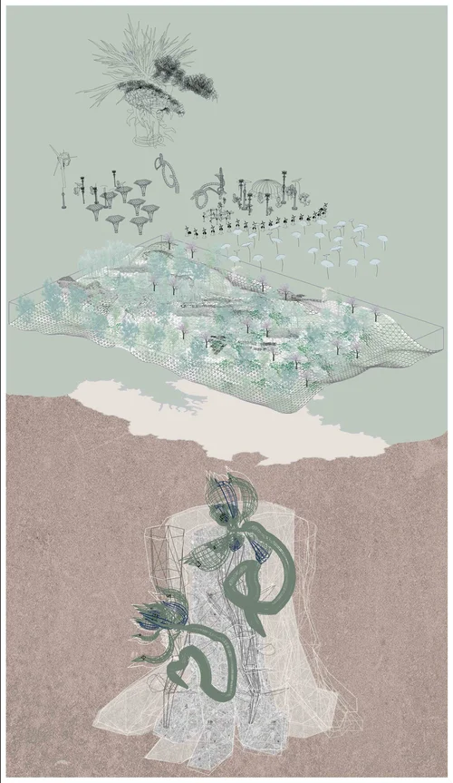 In this project, I will adopt various roles of the zoologist, archaeologist, historian, botanist to examine an ever-shifting landscape of cross-pollination, animal species and rock formation. Through understanding existing landscape mechanisms which influence memory and migration, a new port of hybridisation will make concise changes to the landscape experience. This port and its alteration to the landscape will serve the purpose for allowing the crossing of species to become hybrid and to be given altered memory for this landscape, creating new ways for these species to exist and migrate.